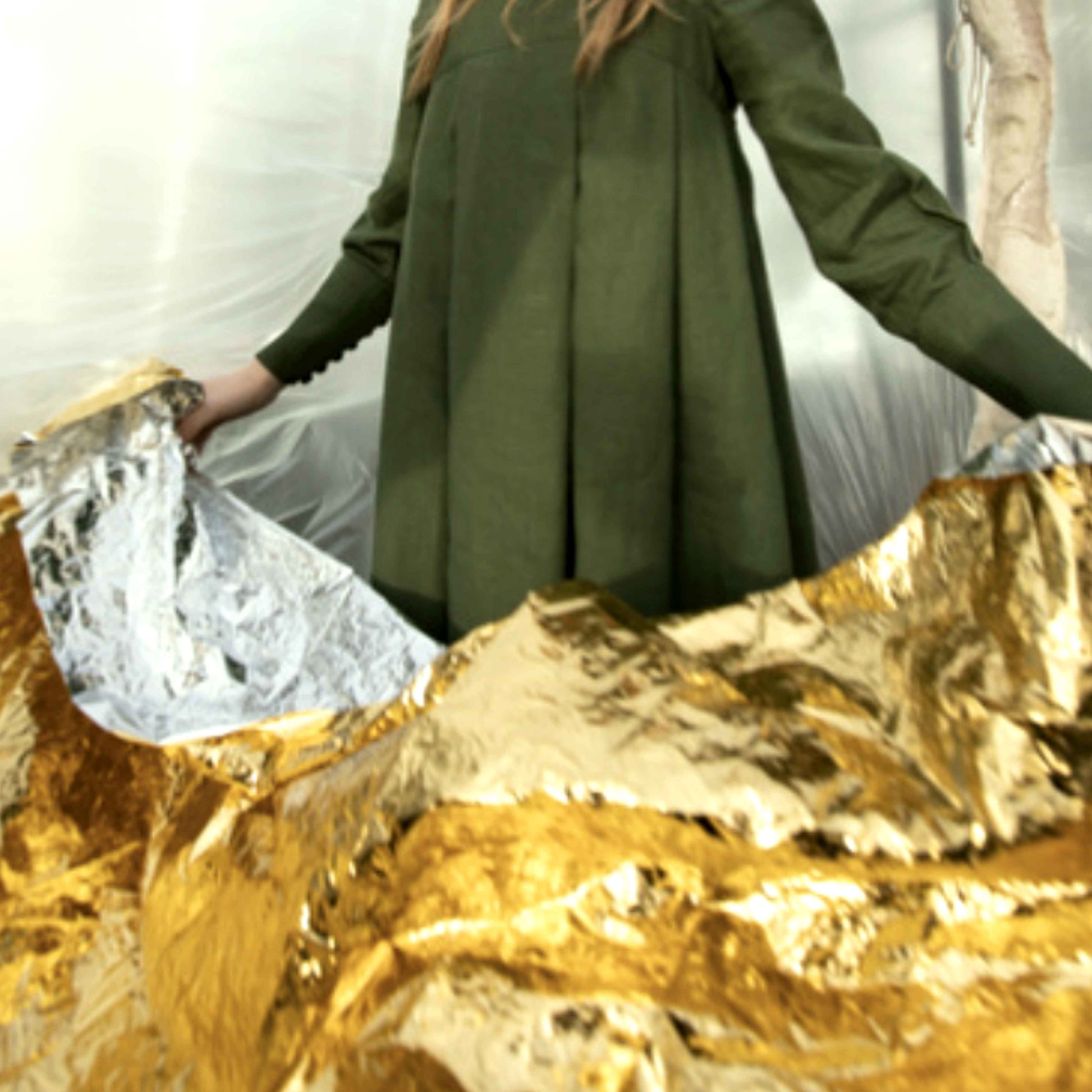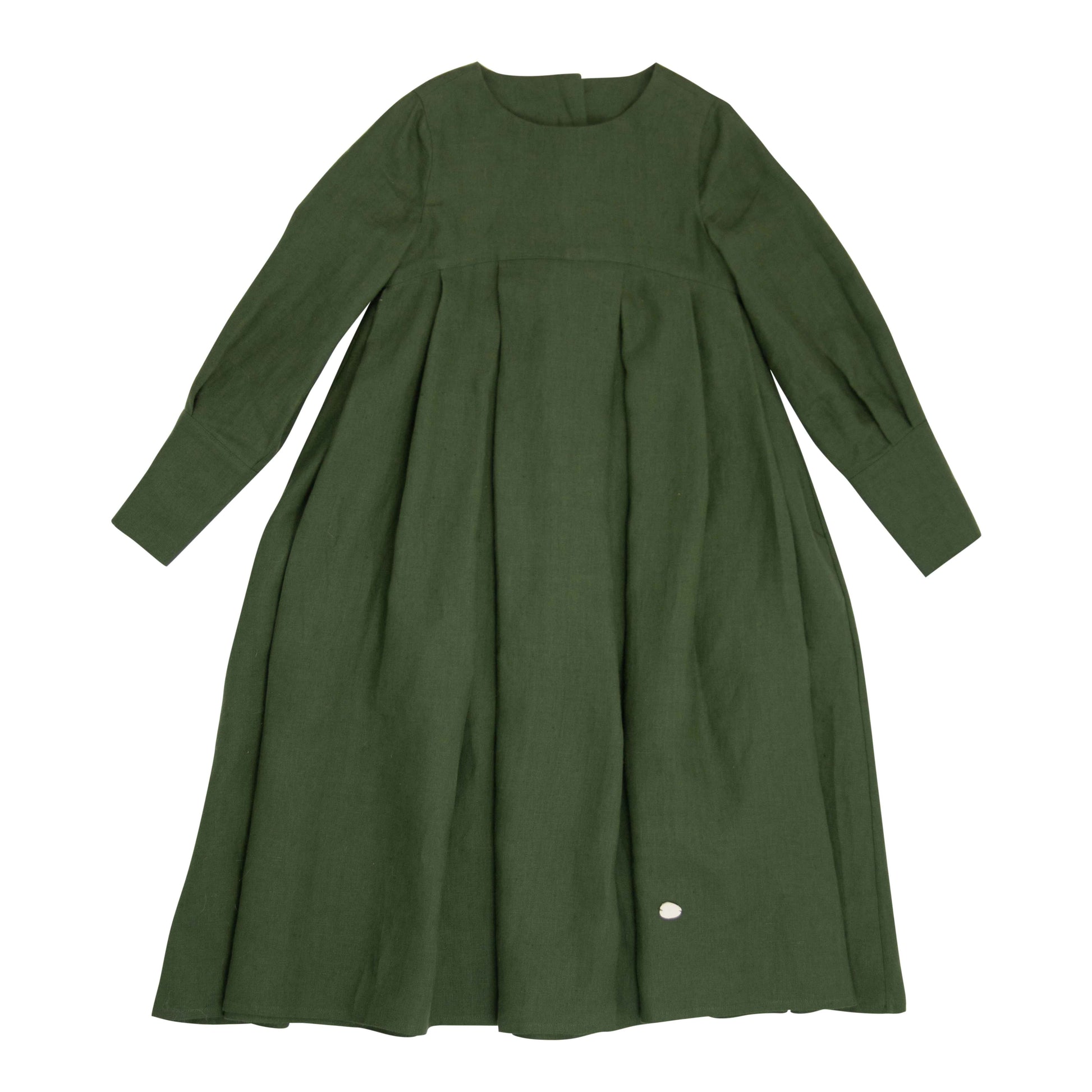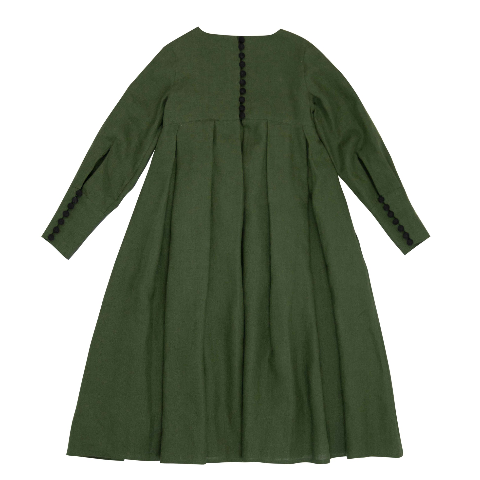UPA Astrid dress in luxurious forest green linen. Featuring delicate pleats under the chest in the front and back, this dress is adorned with a beautifully fastened black linen button line at the back and on the extended cuffs.