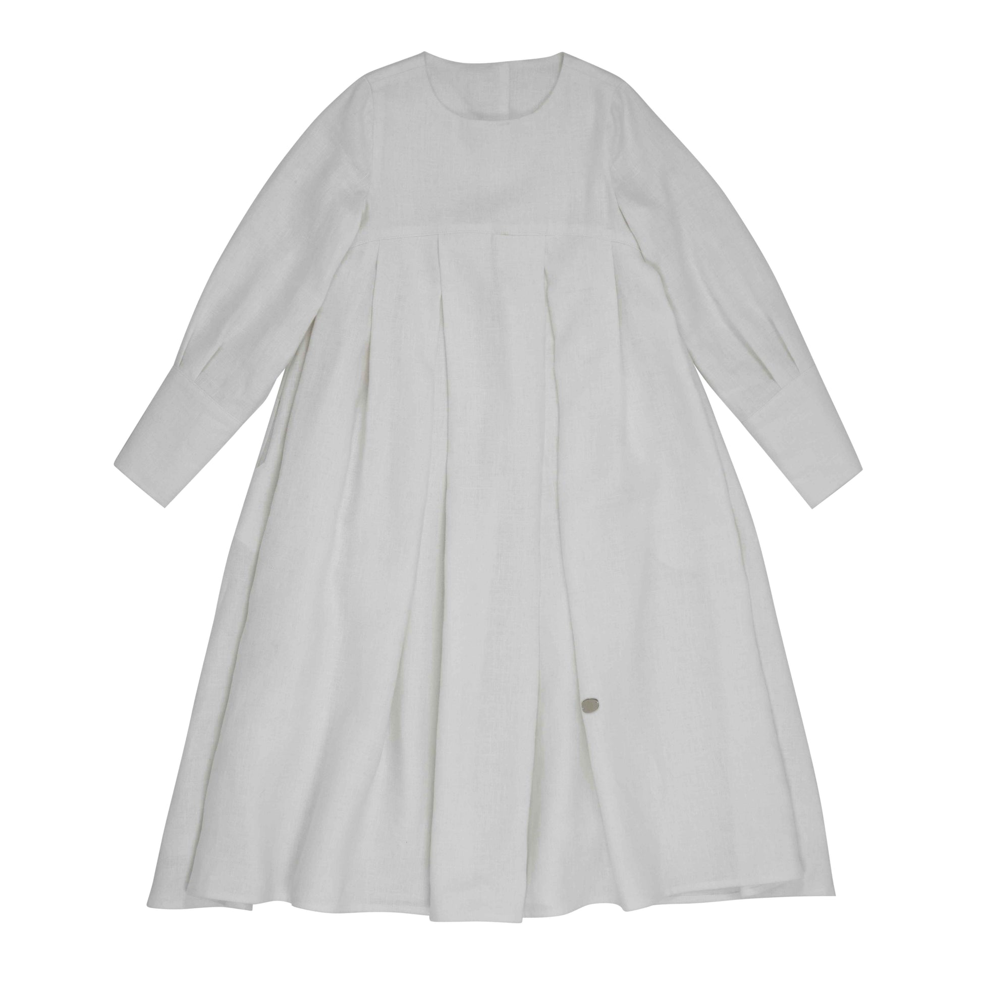 UPA Astrid dress in white linen. Featuring delicate pleats under the chest in the front and back, this dress is adorned with a beautifully fastened shell button line at the back and on the extended cuffs.