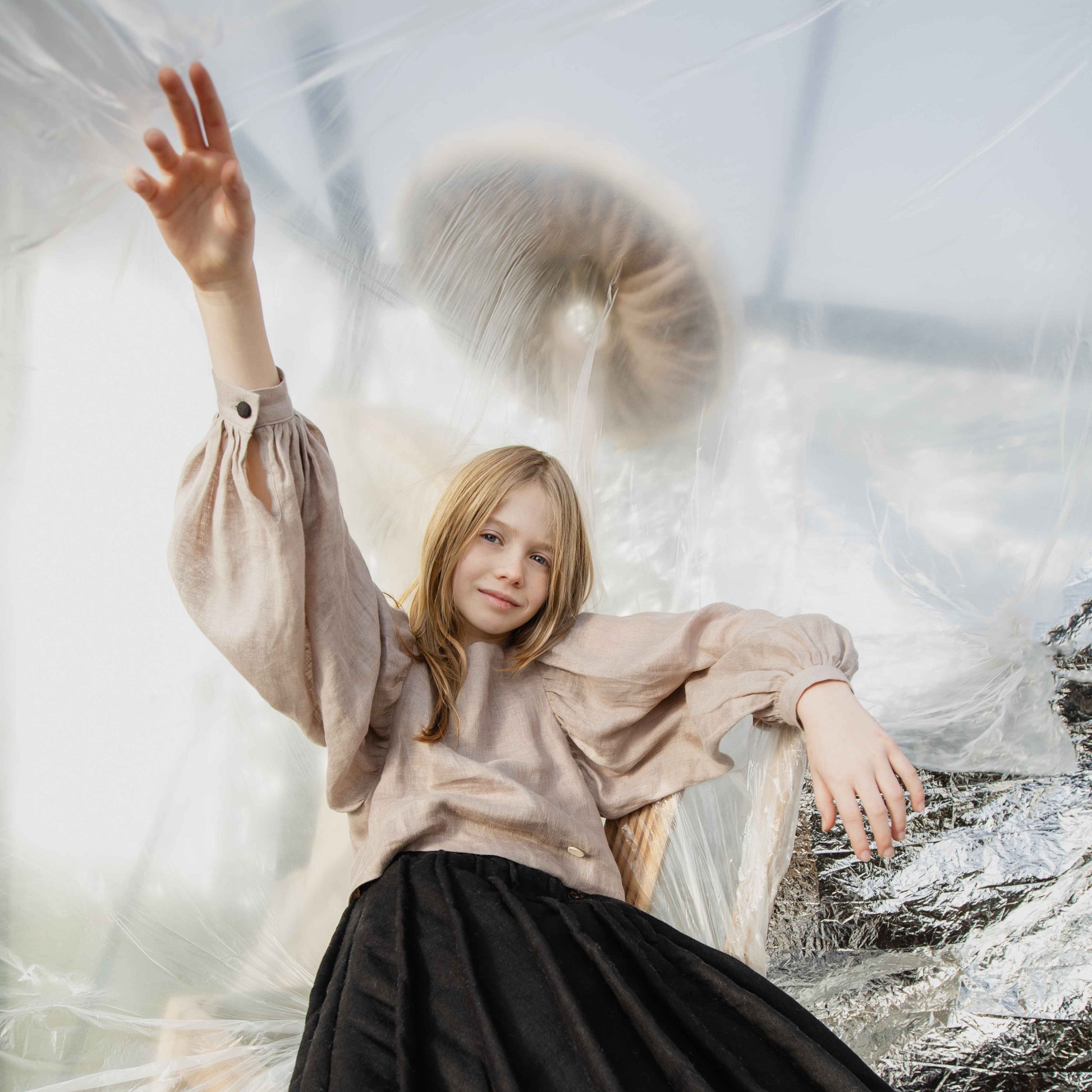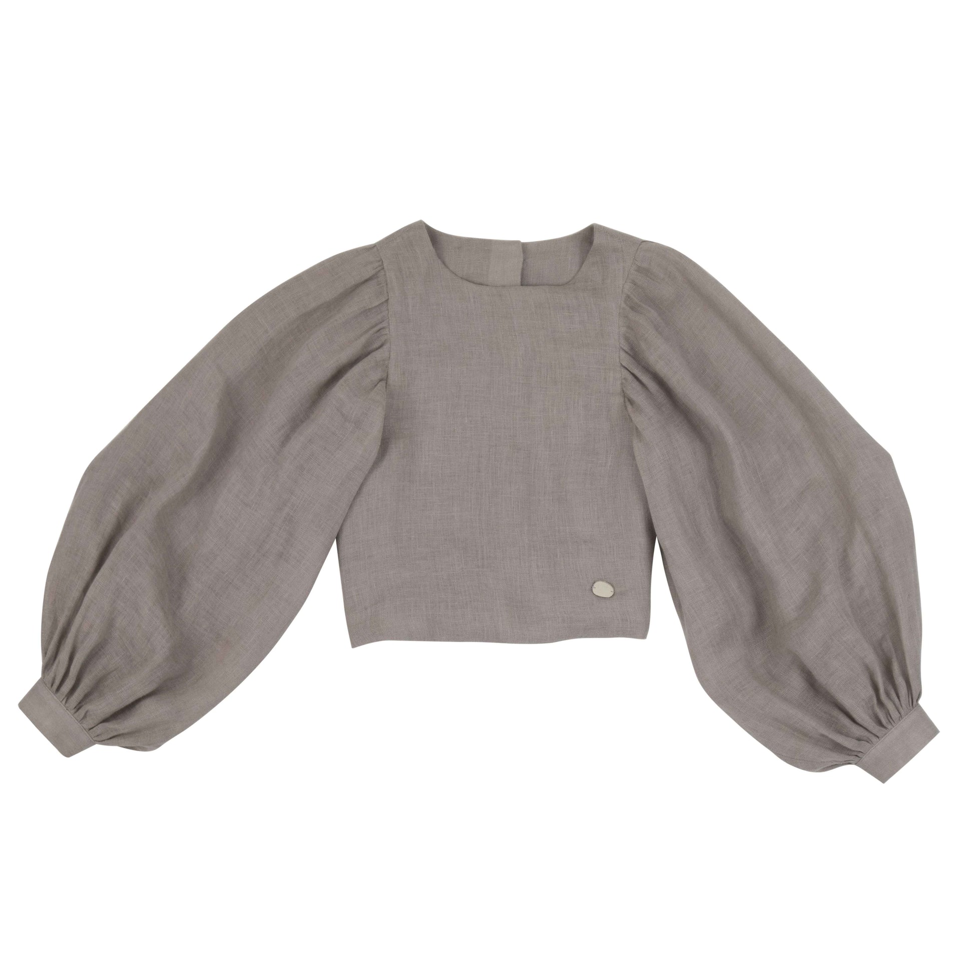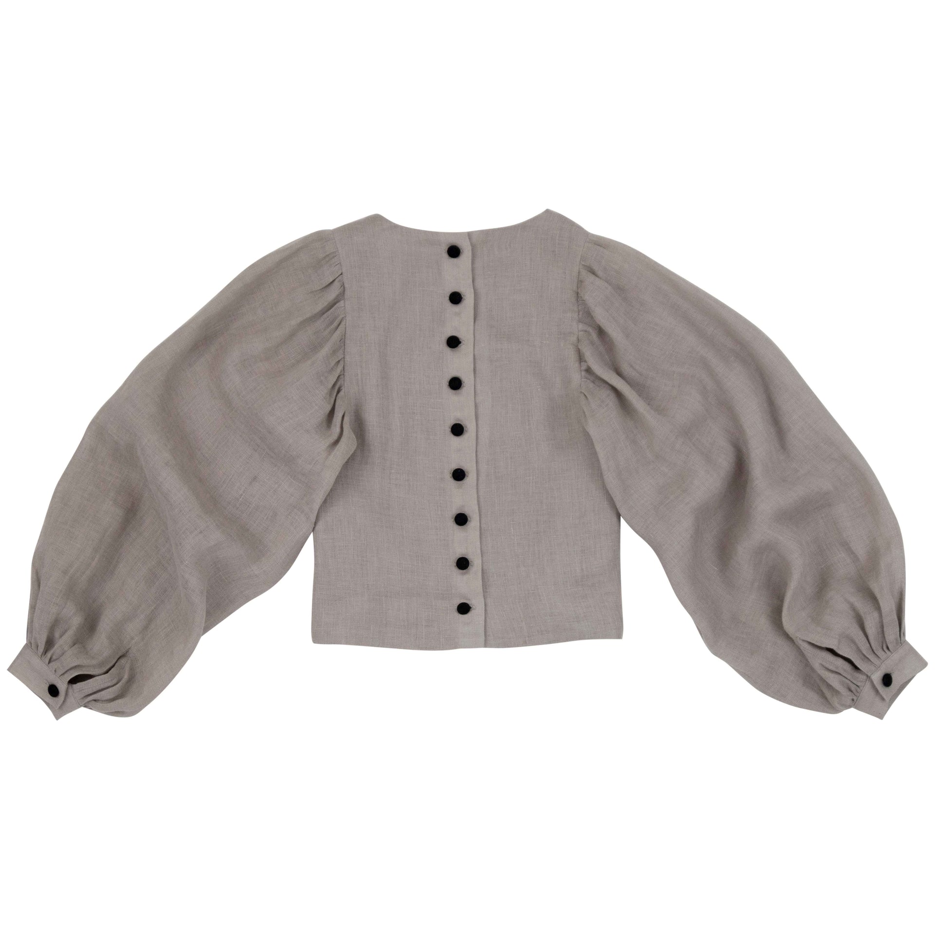 UPA Carmen blouse in lightweight natural linen, boasting heavily puffed sleeves and black linen buttons on the back, including a black button on the sleeve cuffs.