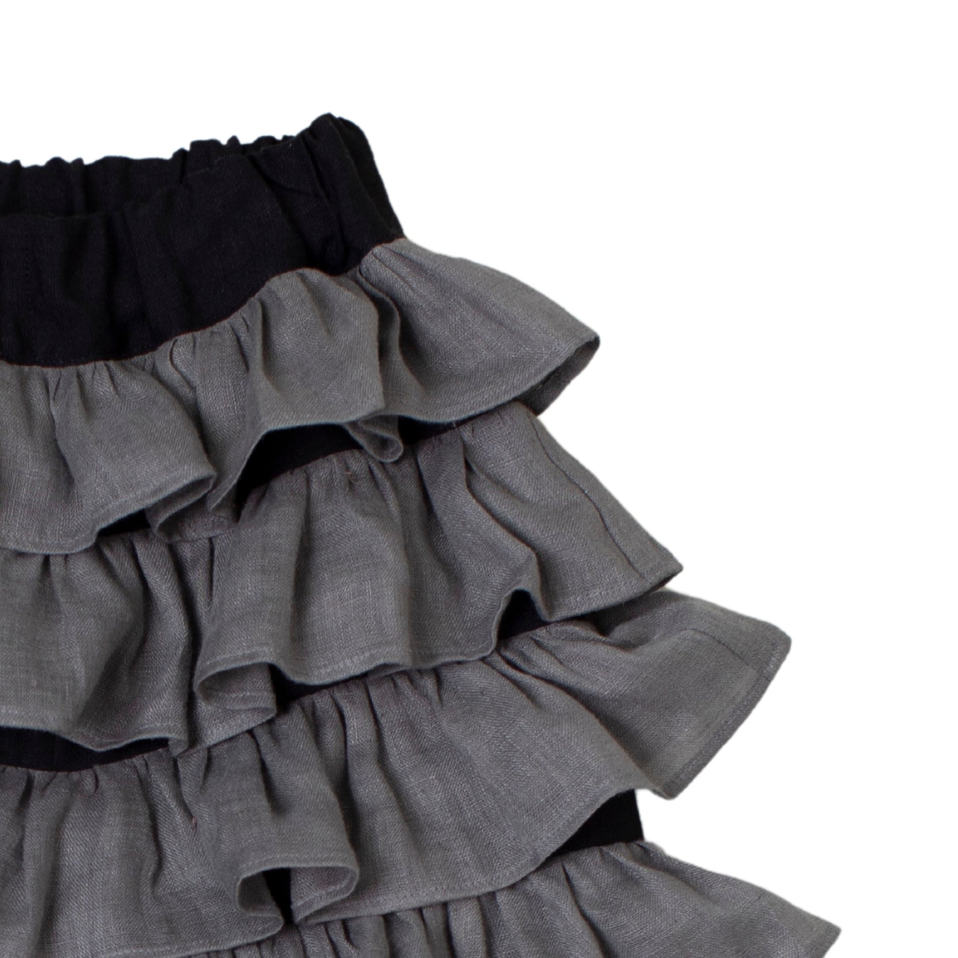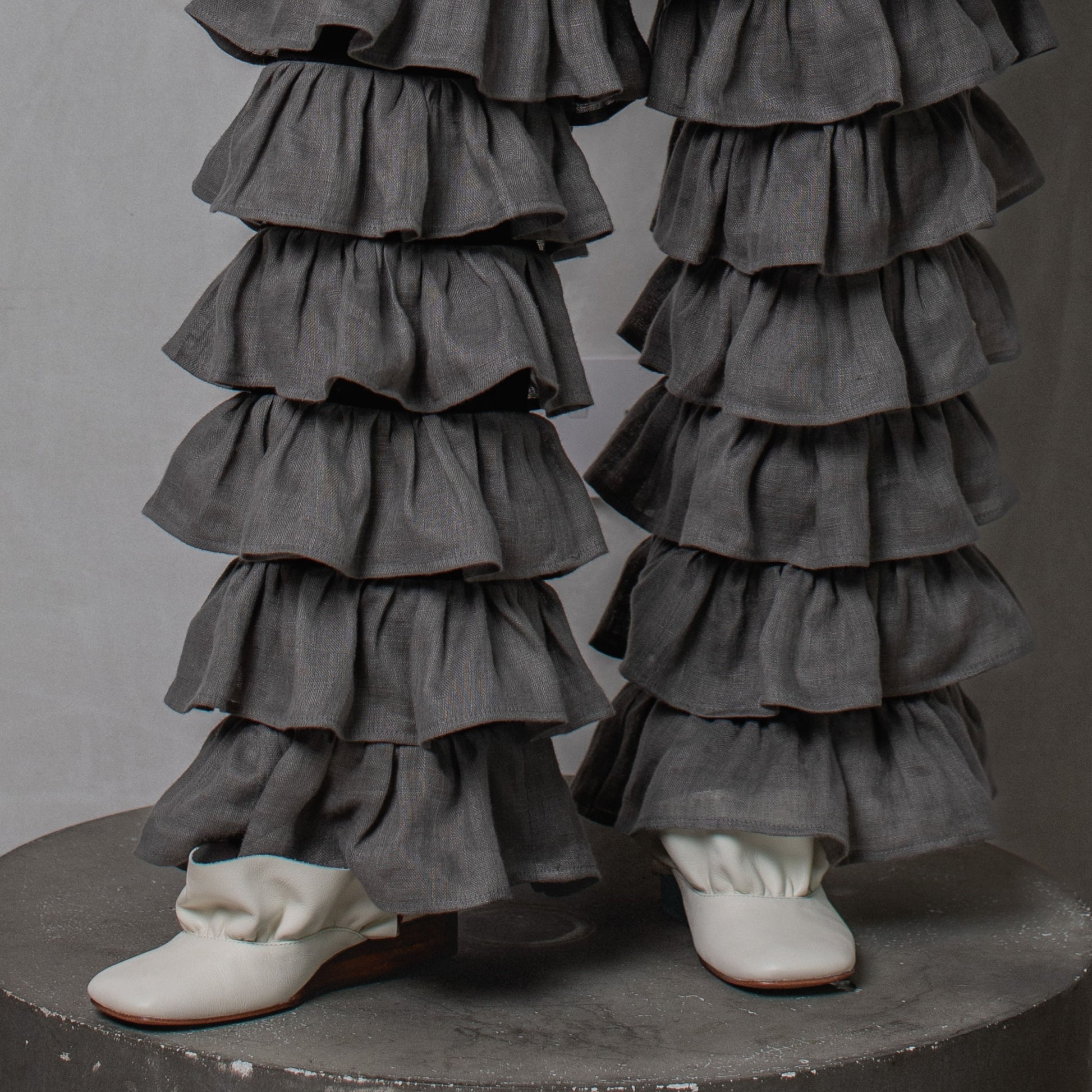 The Darling Slate Trousers are crafted from 100% European OEKO-TEX® certified linen in a soft slate-grey tone. Featuring multiple tiers of ruffles from waist to hem, these trousers create a voluminous and sculptural silhouette while remaining lightweight and breathable. The elasticated waistband provides a comfortable fit and allows easy movement, making them both expressive and wearable. Designed in Ireland and ethically made in Lithuania, they are suitable for children aged 2–12 years.