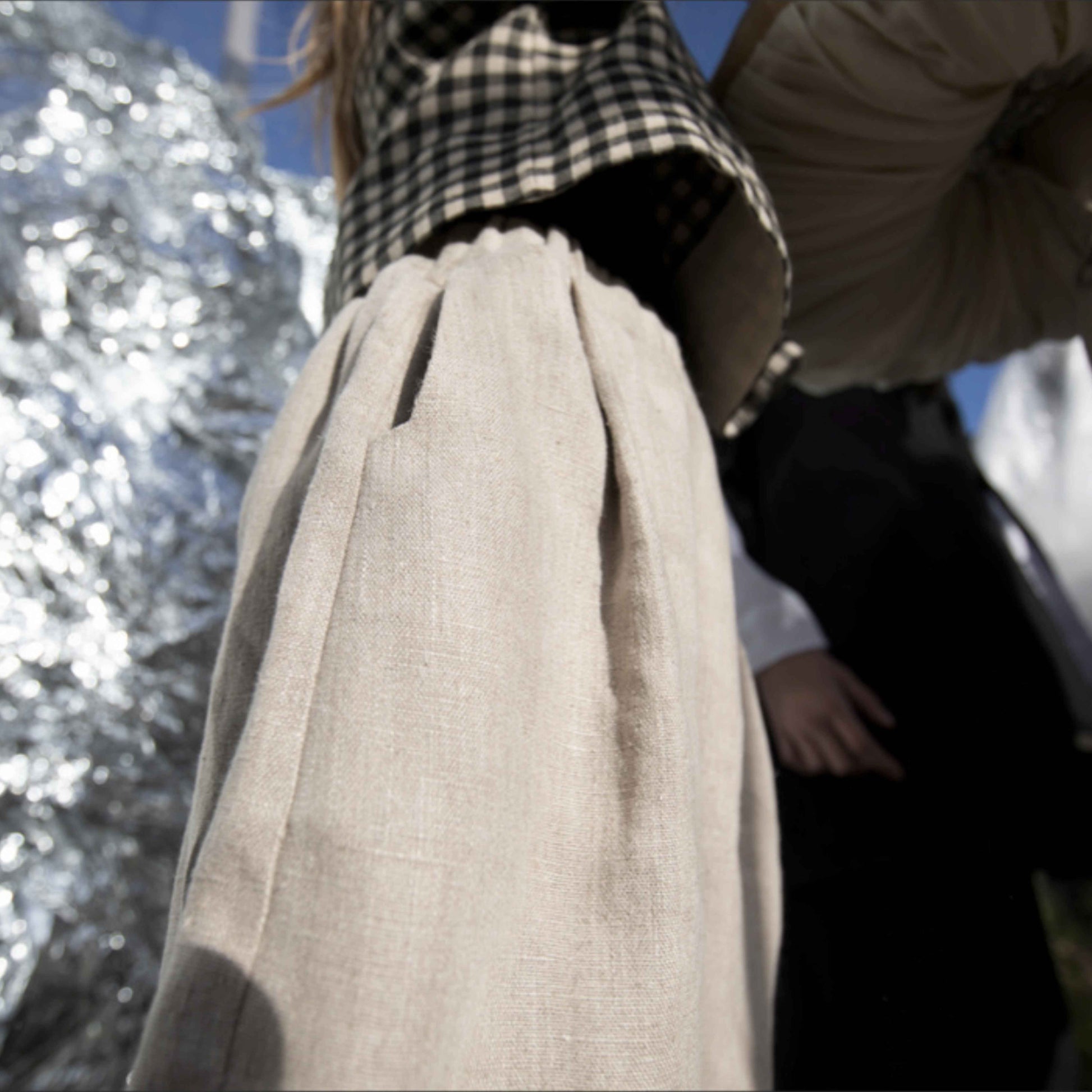 UPA Delilah trousers featuring expressed hips from natural heavy linen. Has pockets and black linen buttons on the bottom.
