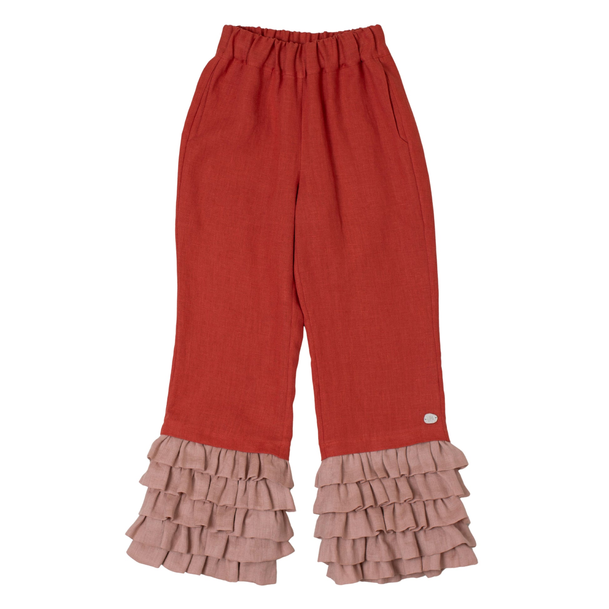 The Embyr Burnt Orange Trousers are made from 100% European OEKO-TEX® certified linen in a warm burnt orange shade. They feature a relaxed straight-leg silhouette with gathered ruffle detailing at the hem in a soft blush contrast tone. Designed with side pockets and an elasticated waistband for comfort, these trousers combine playful texture with practicality. Designed in Ireland and made in Lithuania, they are suitable for children aged 2–12 years.