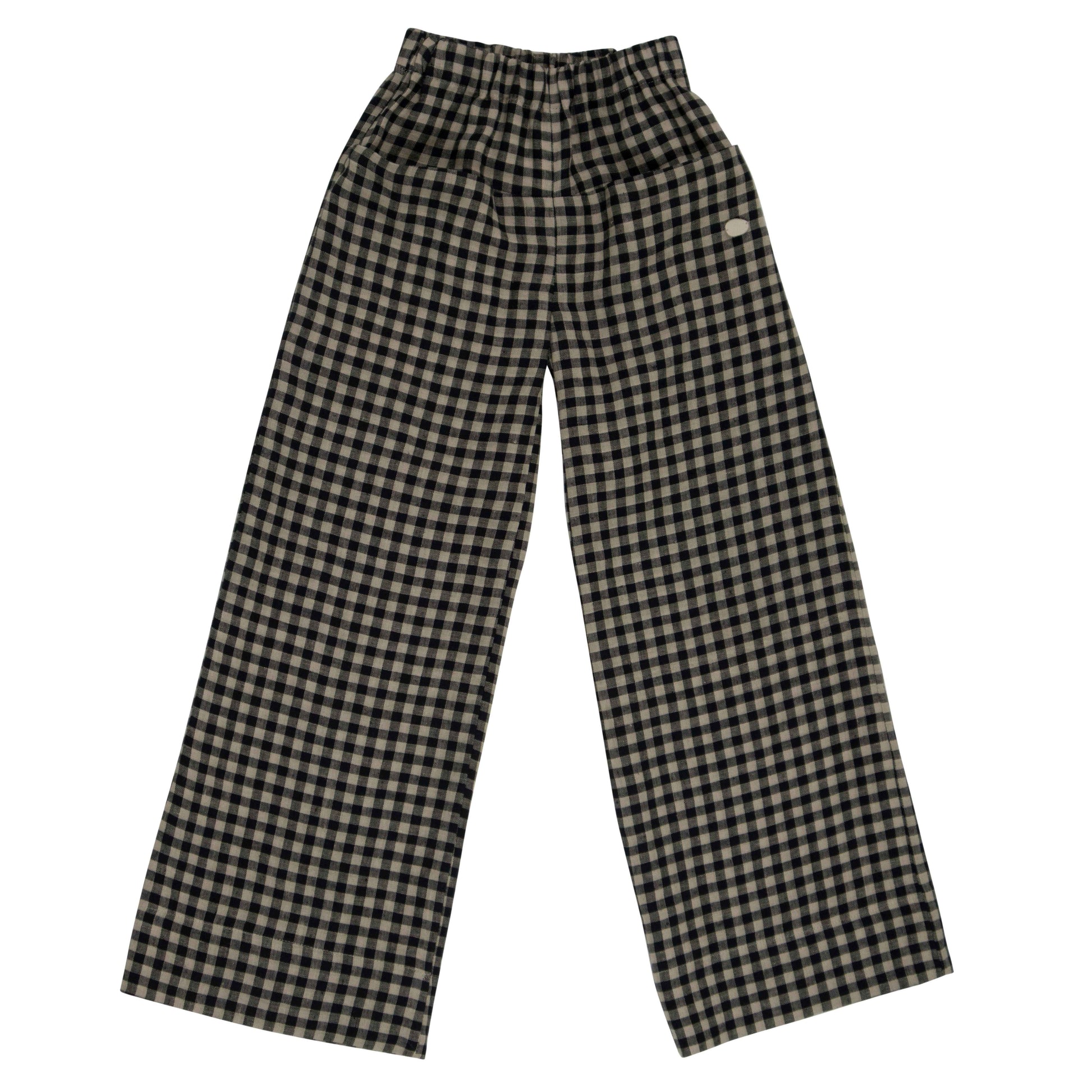 UPA Harper trousers featuring front pockets in checkered natural and black linen, with a natural linen hem on the interior of the bottoms and pockets.