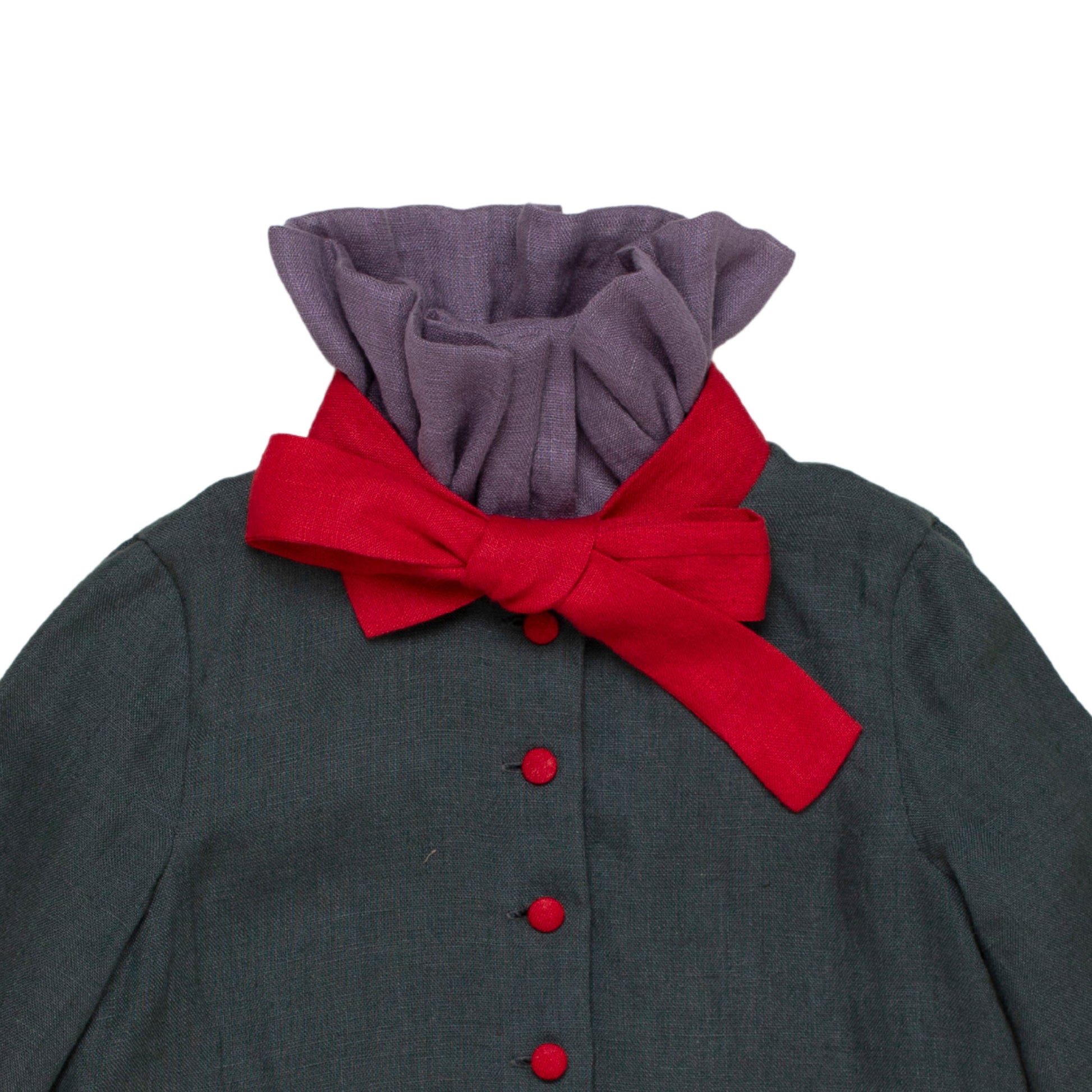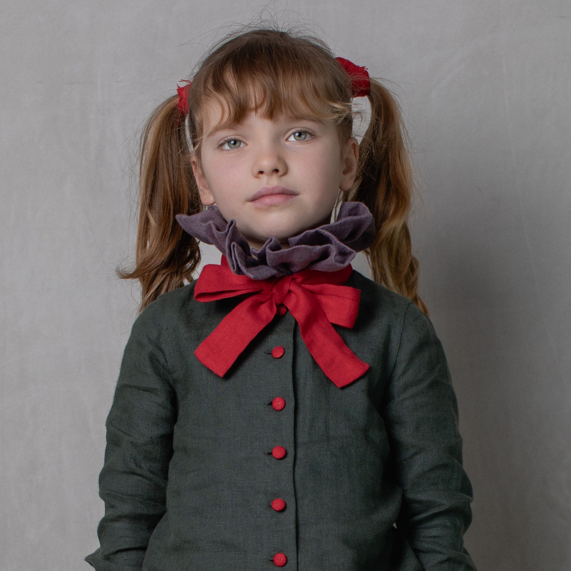 The McKenzie Blouse is crafted from 100% European OEKO-TEX® certified linen in deep slate. It has a straight cut with long sleeves, a front closure finished with fabric-covered red buttons, and a structured ruffled stand collar in mauve accented by a bold red bow at the neck. Designed in Ireland and made in Lithuania, it’s breathable, comfortable, and suitable for children aged 2–12 years.