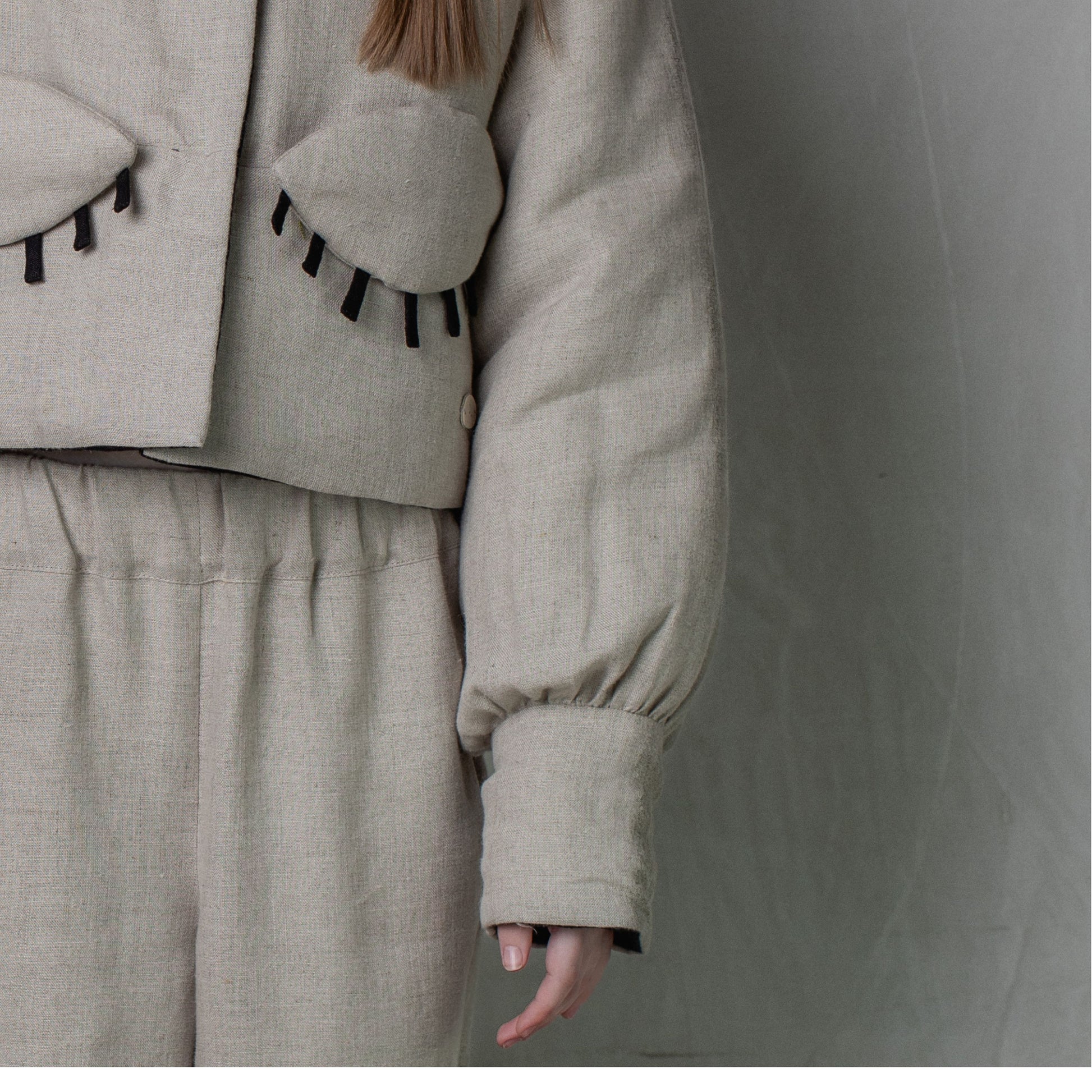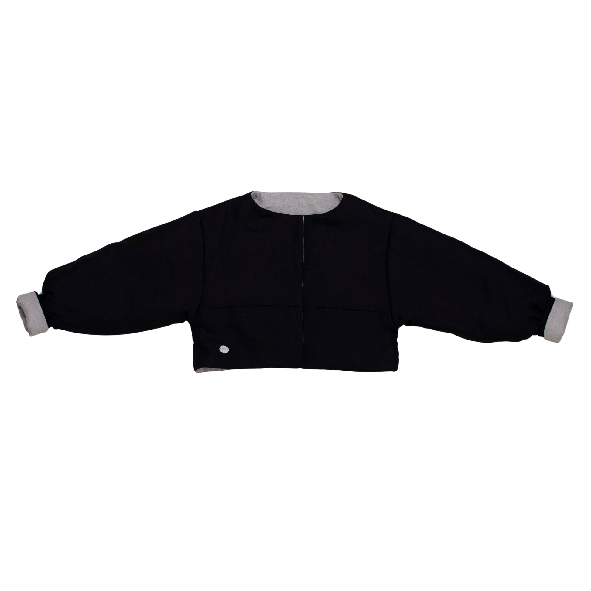 The Paige Jacket is crafted from 100% European OEKO-TEX® certified linen in contrasting tones of soft grey and deep black. This cropped jacket features voluminous sleeves with gathered cuffs and playful eye appliqués across the front, bringing an artistic touch to its sculptural silhouette. It is fully reversible, allowing it to be worn inside out for a clean, minimalist black look or with the detailed appliqué side for a more expressive style. Designed in Ireland and made in Lithuania, it is suitable for children aged 2–12 years.