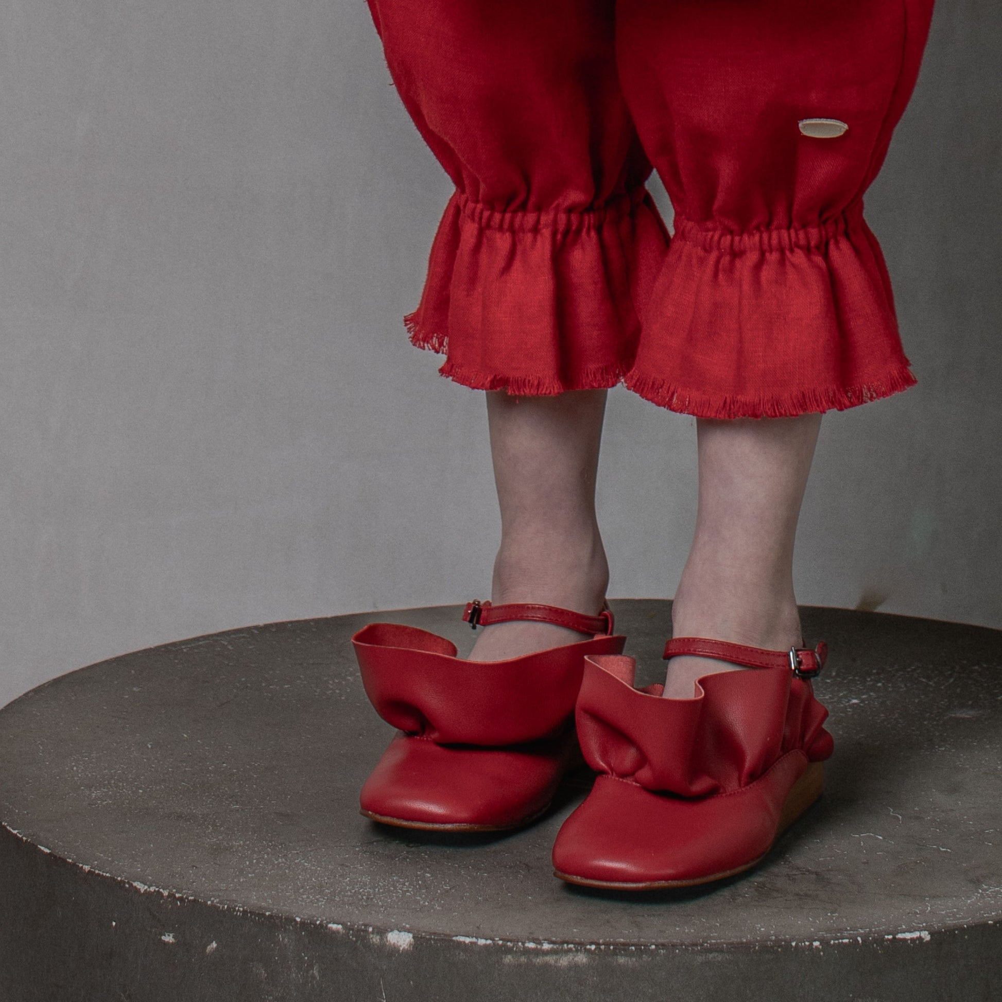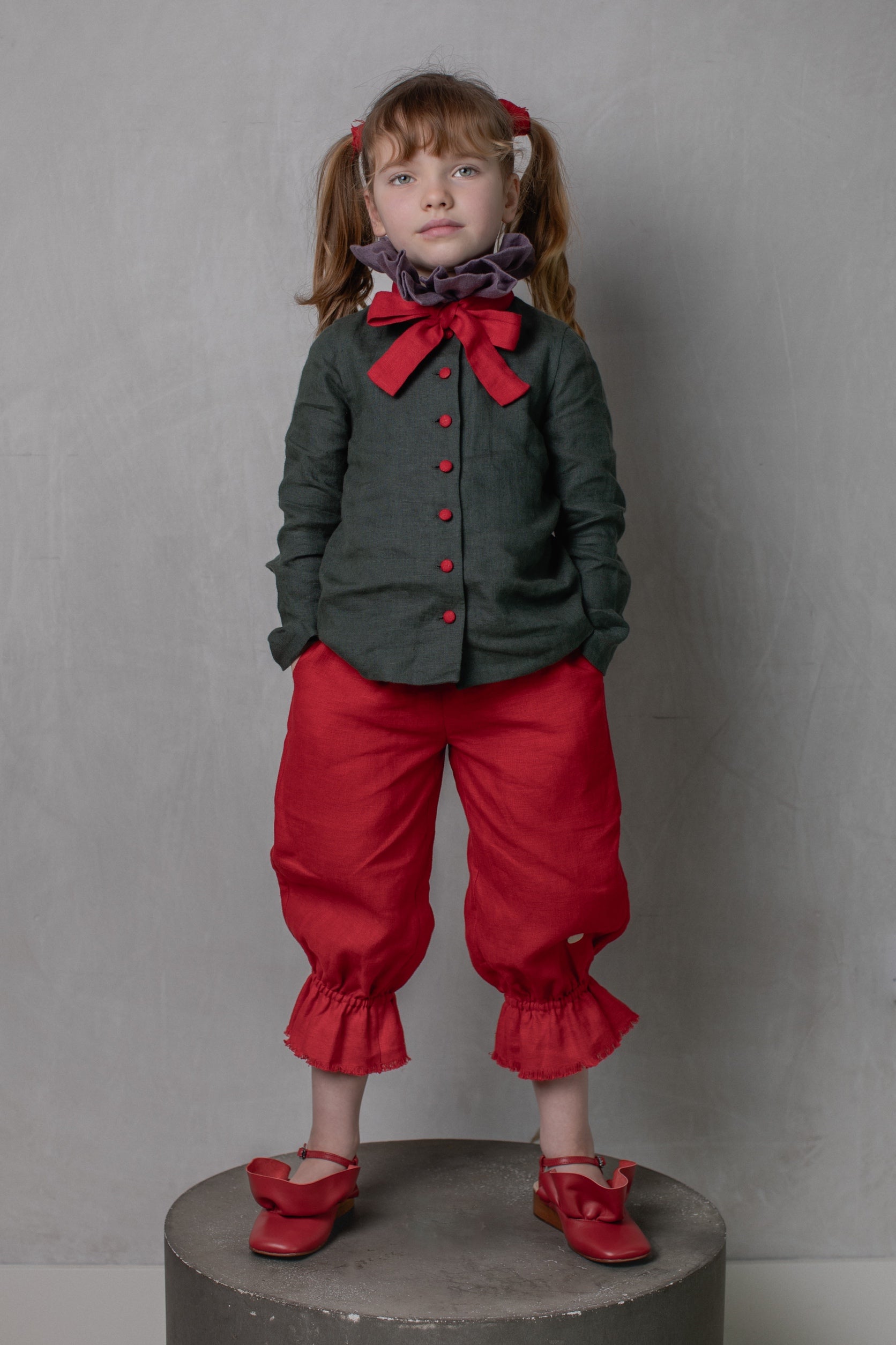 The Peggy Trousers are made from 100% European OEKO-TEX® certified linen in bright red. They feature an elastic waistband for comfort, side pockets, and softly gathered hems with a small frill finish. The relaxed cut makes them easy to wear while keeping a neat shape. Designed in Ireland and made in Lithuania, suitable for children aged 2–12 years.