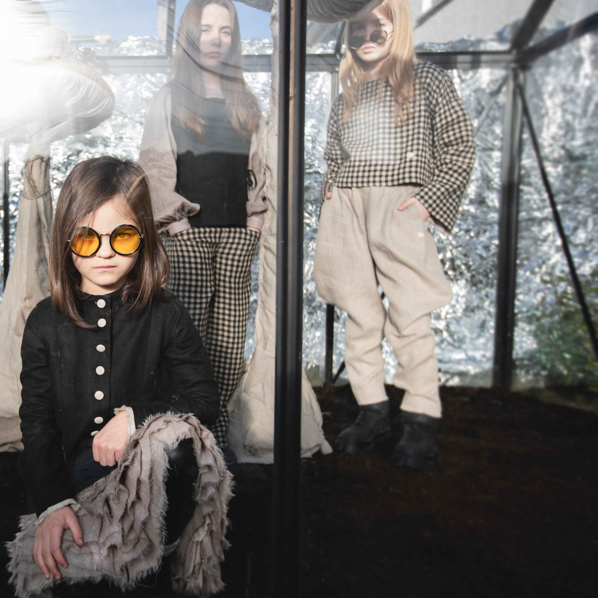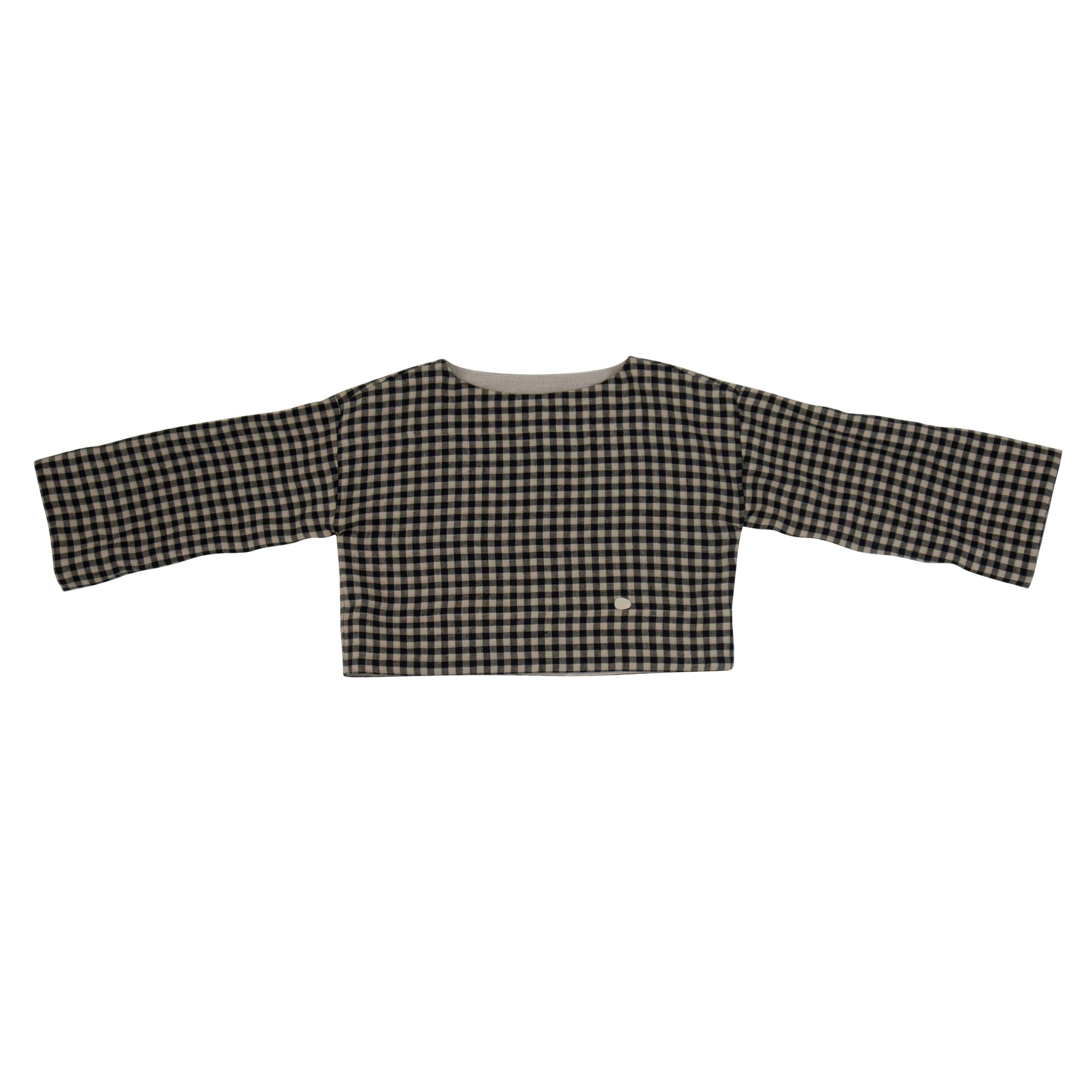 UPA Sabrina Blouse in checkered natural and black linen, featuring hems on the interior of sleeves the bottom and around the neck area. This oversized yet short blouse is perfect for versatile styling.