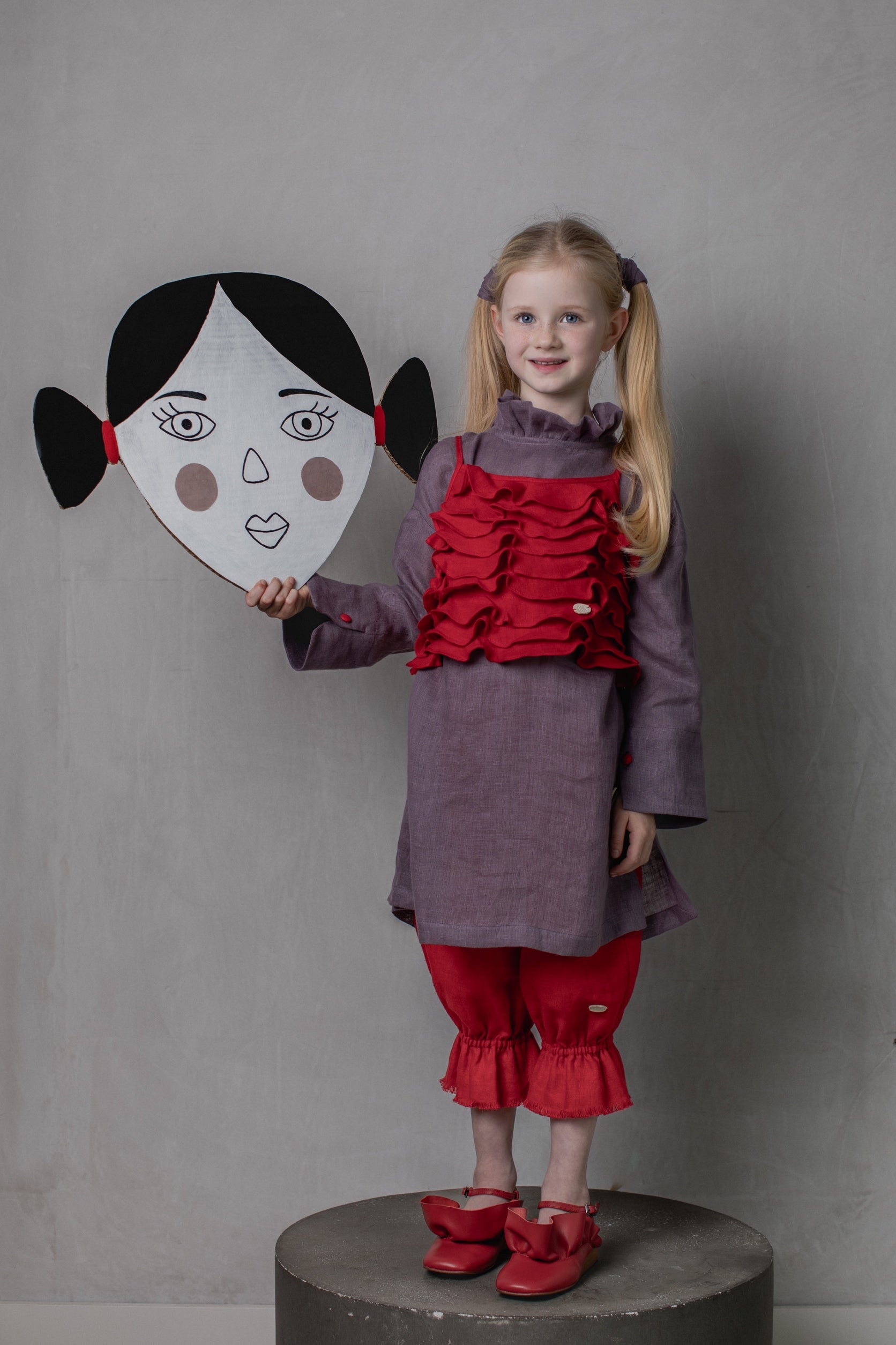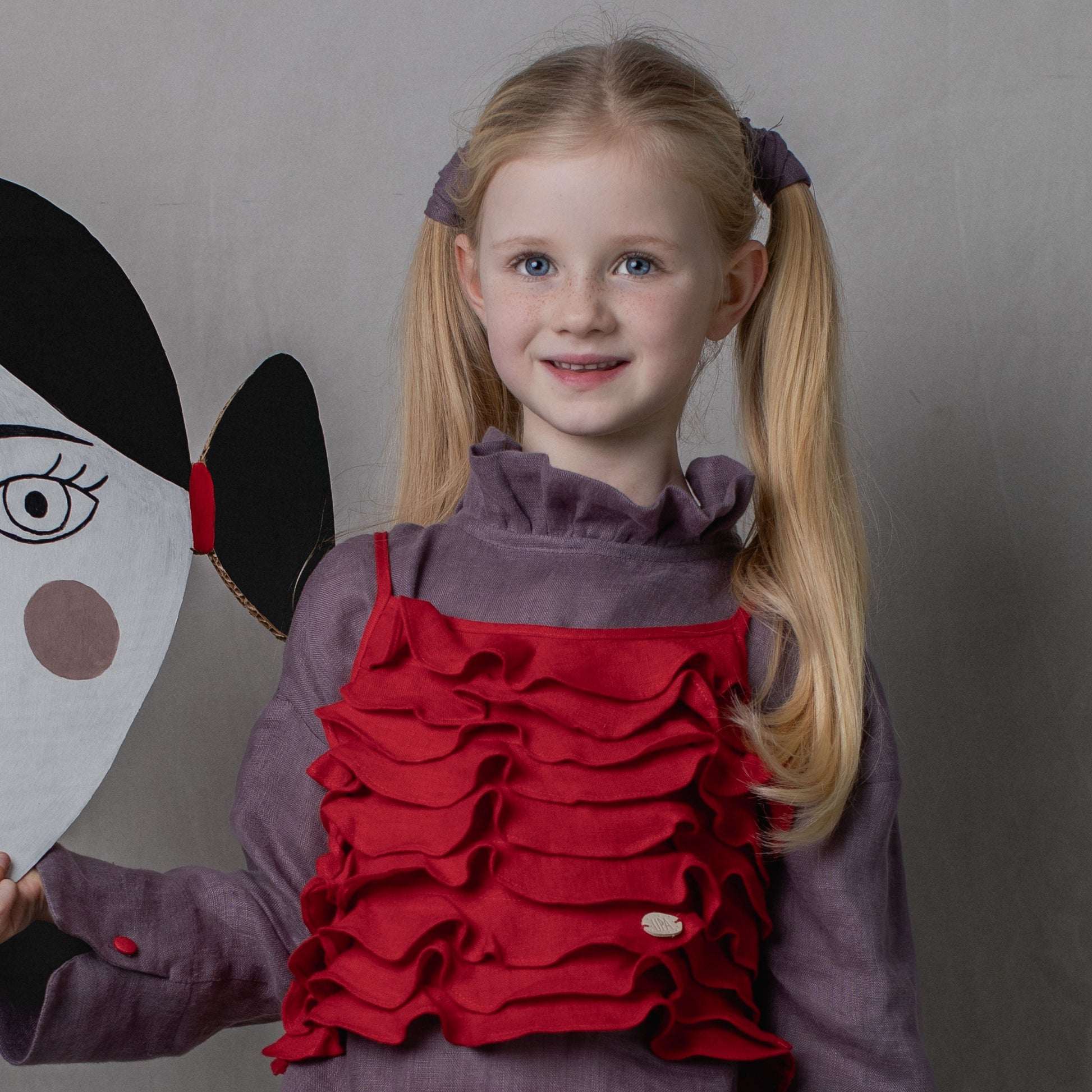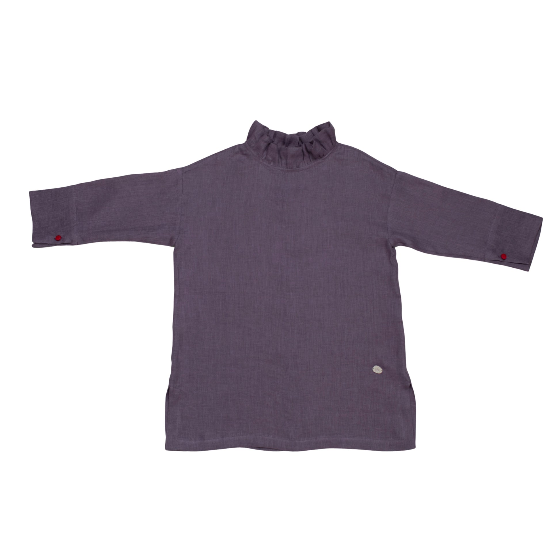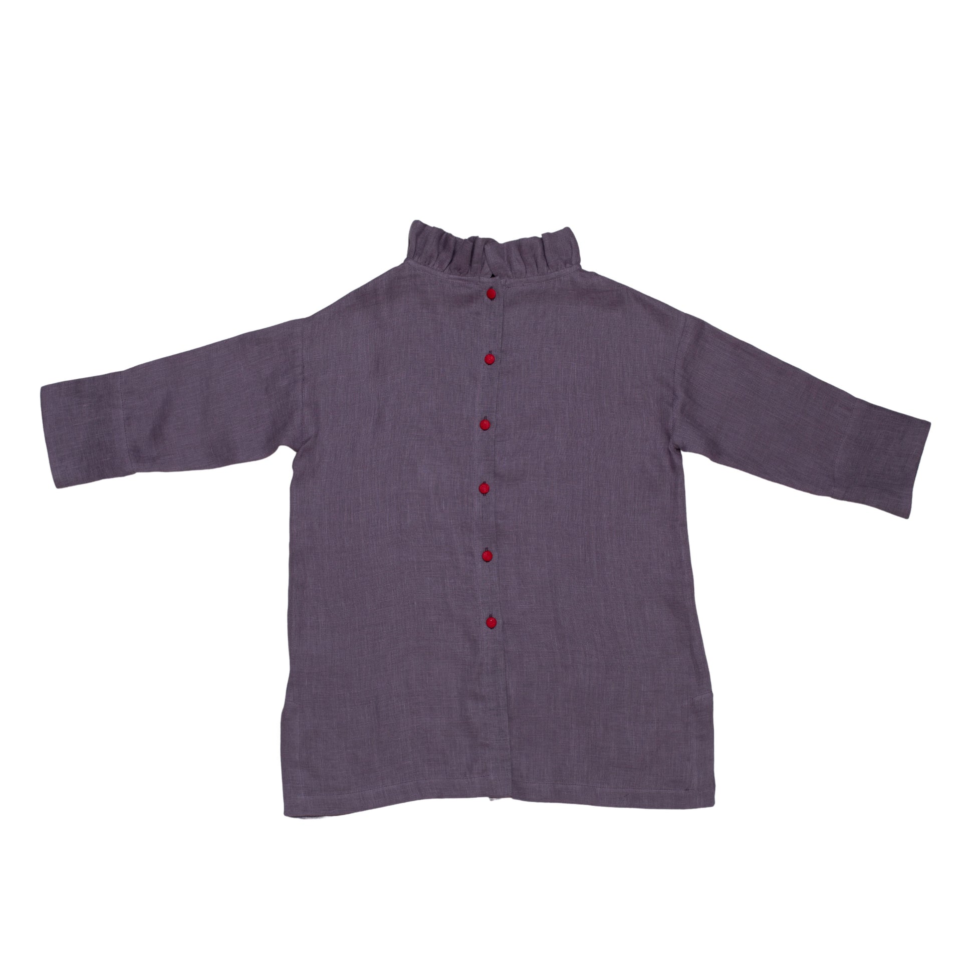 The Tauriel Blouse is made from 100% European OEKO-TEX® certified linen in soft mauve. It features a gathered ruffle neckline and contrasting red buttons down the back, adding a subtle touch of colour. The long sleeves include small red button details at the cuffs for a clean, tailored finish. Designed in Ireland and made in Lithuania, suitable for children aged 2–12 years.
