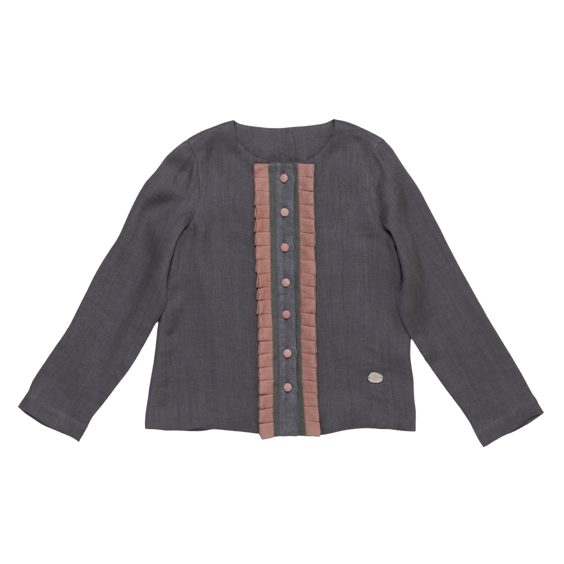 The Trinket Blouse is crafted from 100% European OEKO-TEX® certified linen in slate grey with contrasting blush pleats and covered buttons along the front panel. The structured silhouette and clean lines make it an elegant yet wearable piece for any occasion. Designed in Ireland and made in Lithuania, suitable for children aged 2–12 years.